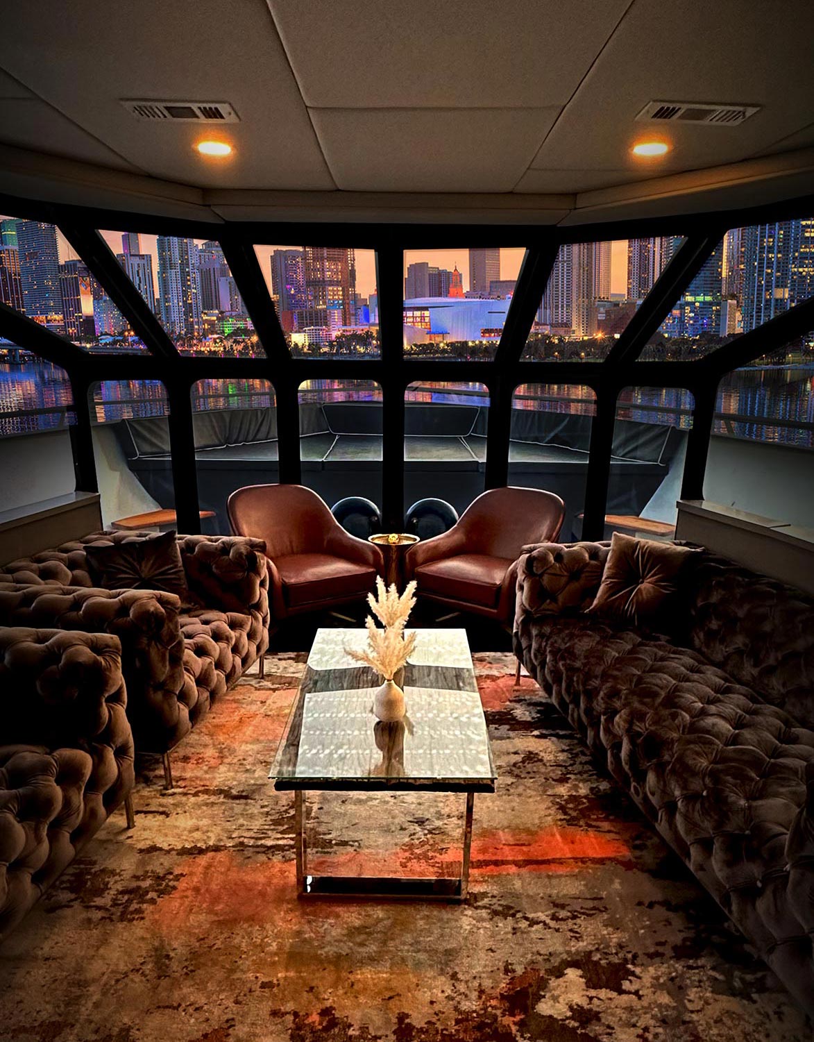 Outside space from which to watch the world sail by. Exquisite hors d’œuvre menus served for your guests at the Skydeck while cruising the Miami River and other breathtaking views of South Florida. Connecting seamlessly, the SkyLounge cocktail bar adds to the experience by providing a complementary setting to sip Champagne or wine as you sail into the sunset.